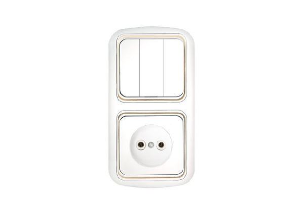 Блок розетка+выключатель трёхклавишный С/У, Б/З, 3В-РЦ-537, бел/зол, Bylectrica, Гармония, Беларусь