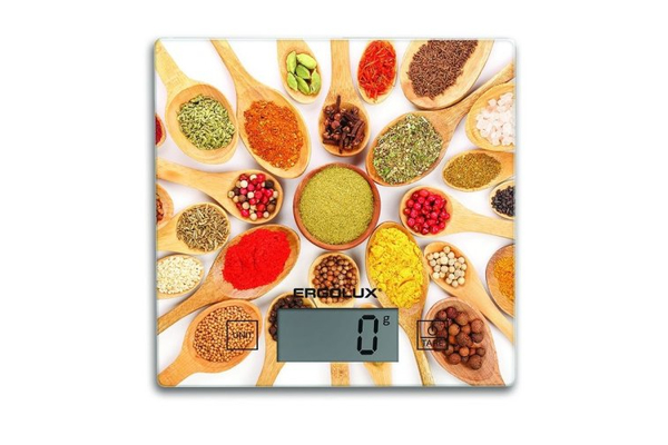 Весы кухонные электронные Ergolux ELX-SK01-C11 Яркие приправы, до 5 кг,15*15см, ЖК дисплей, 1х CR2032 1872