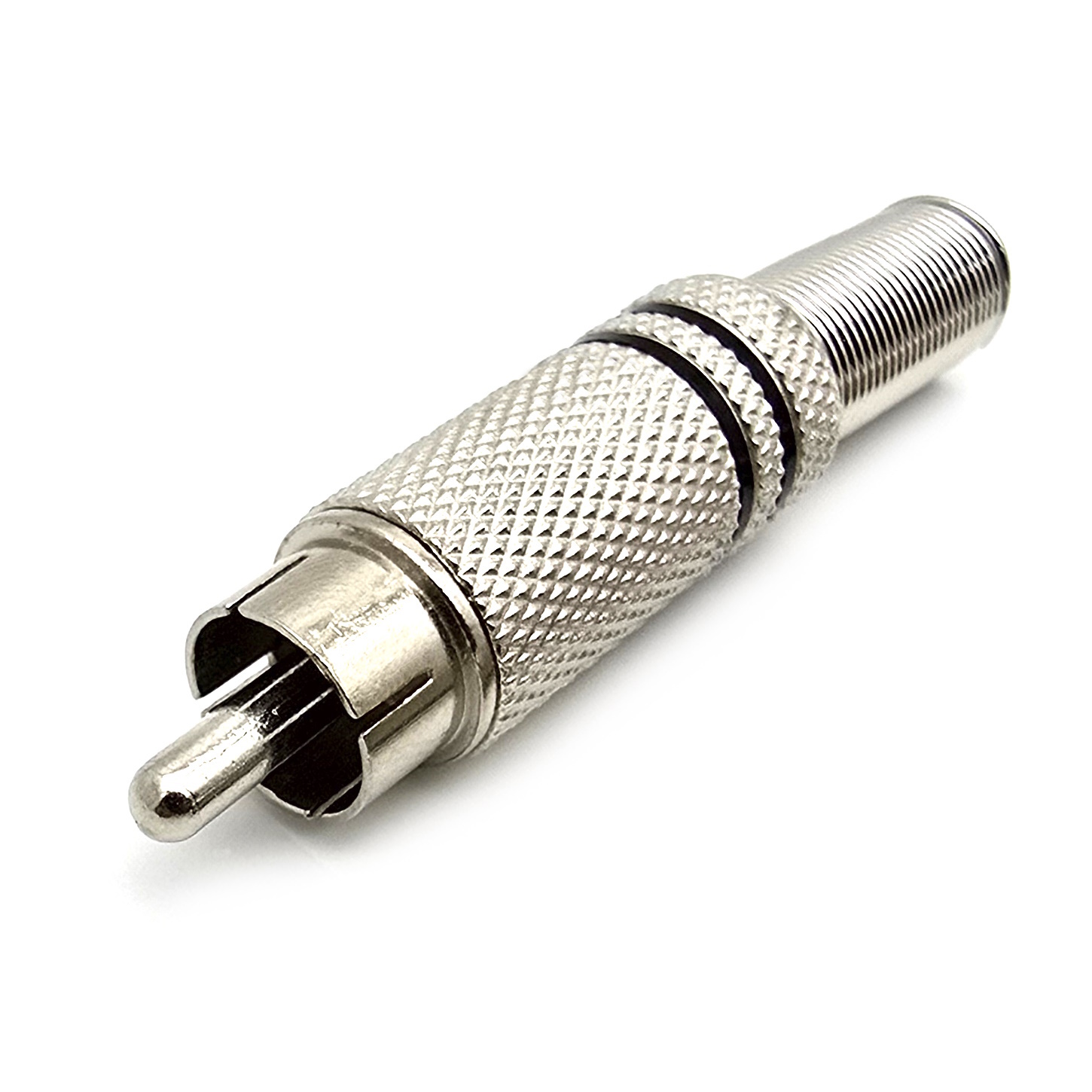 Штекер RCA тюльпан металл, L=45мм, под пайку, серебро, пружина антизалом, 2 кольца черные, D-6мм