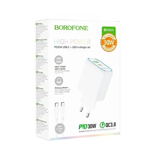 СЗУ на PD (гнездо Type-C) + USB BOROFONE BA89A, PD30ВТ, QC3.0A + кабель Type-C-Type-C, белый