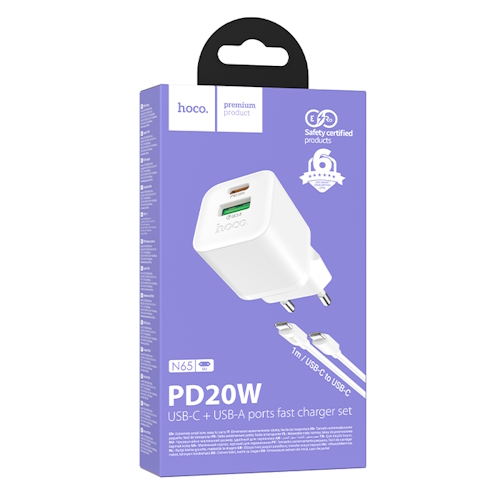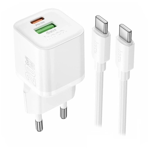 СЗУ на PD (гнездо Type-C) + USB HOCO N65, PD20ВТ, QC3.0A + кабель Type-C-Type-C, белый