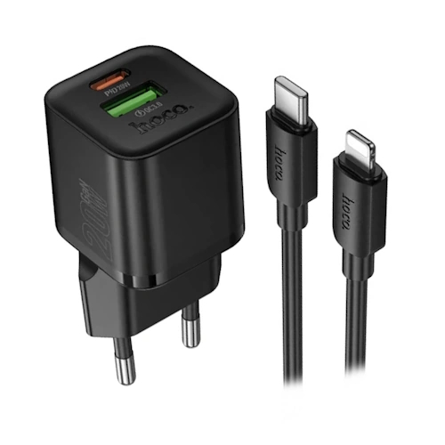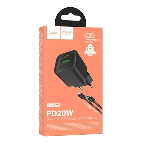 СЗУ на PD (гнездо Type-C) + USB HOCO N65, PD20ВТ, QC3.0A + кабель Type-C-Lightning, черный