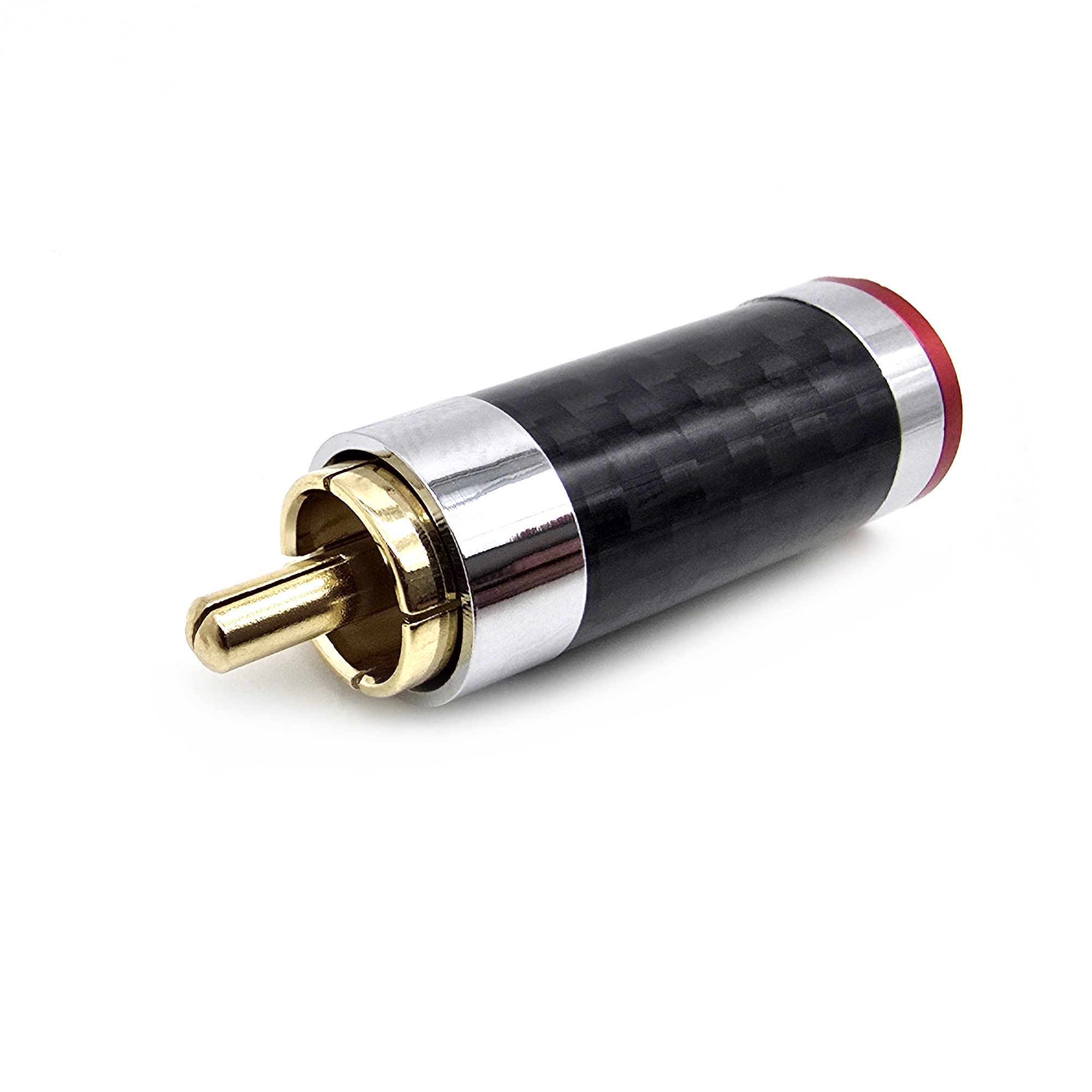 Штекер RCA тюльпан металл, L=38мм под пайку, карбон, выход D=6,5мм, красная полоса