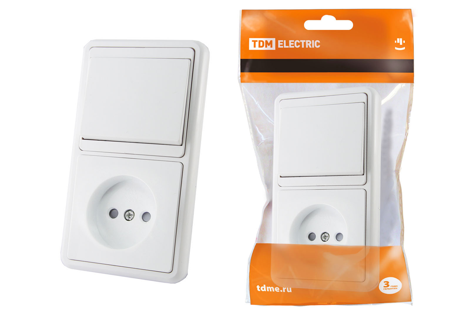 Блок вертикальный розетка+выключатель 1-клавишный белый c/у, б/з, з/ш БКВР TDM