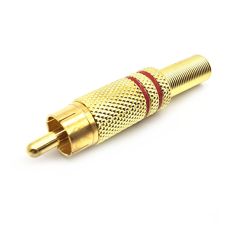 Штекер RCA тюльпан металл, L=45мм, под пайку, золото, пружина антизалом, 2 кольца красный, D-6мм