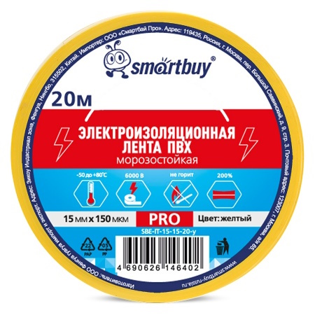 Изолента Smartbuy Pro, 0.15х15мм, 20 метров, жёлтая морозостойкая (SBE-IT-15-15-20-y)