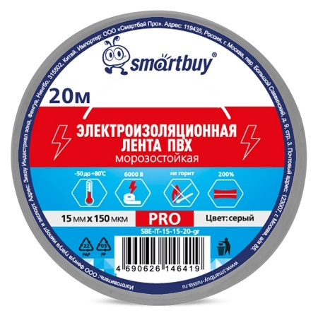 Изолента Smartbuy Pro, 0.15х15мм, 20 метров, серая морозостойкая (SBE-IT-15-15-20-gr)