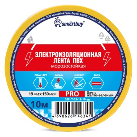 Изолента Smartbuy Pro, 0.15х19мм, 10 метров, жёлтая-зелёная морозостойкая (SBE-IT-15-19-10-yg)