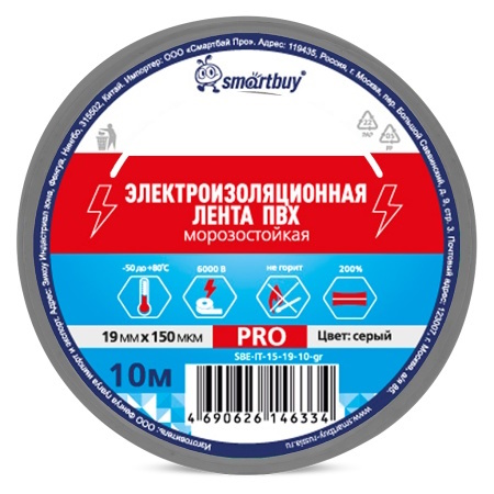 Изолента Smartbuy Pro, 0.15х19мм, 10 метров, серая морозостойкая (SBE-IT-15-19-10-gr)