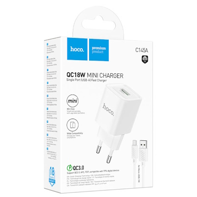 СЗУ на USB HOCO C145A PD18Вт, QC3.0 + кабель USB - Micro USB, белый