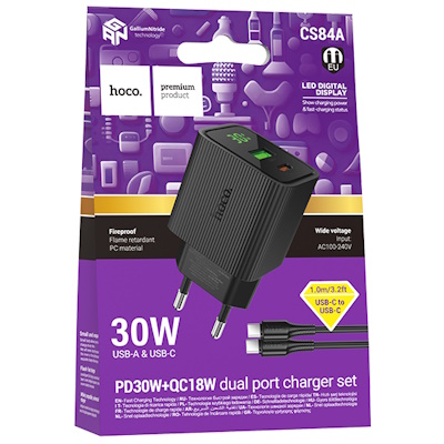 СЗУ на PD+ USB HOCO CS84A 3.0A PD 30W+QC3.0 + кабель Type-C Type-C с LED-дисплеем чёрный